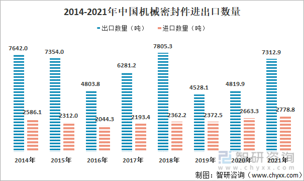 近年来,中国机械密封件出口数量远大于进口数量,说明中国机械密封件产品已被国外市场认可;2021年中国机械密封件出口数量为7312.9吨,进口数量为2778.8吨。