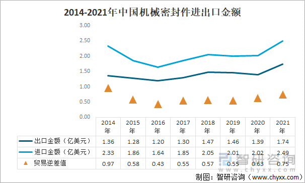 2014-2021年中国机械密封件进出口金额
