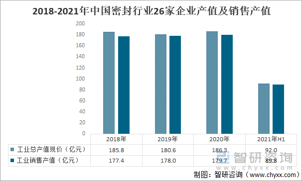 根据对26家密封企业统计:2021年上半年工业总产值为92.0亿元,工业销售产值为89.8亿元。