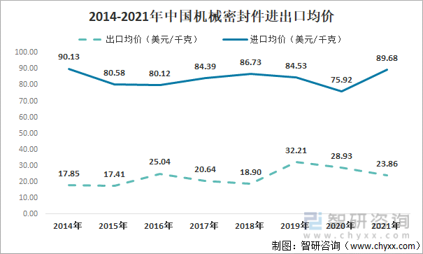 2014-2021年中国机械密封件进出口均价