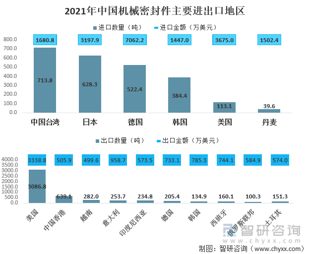 2021年中国机械密封件最大的进口来源地为中国台湾,最大的出口地为美国,从台湾进口713.8吨,占全国总进口量的26%;出口至美国3086.8吨,占全国总出口量的42%。