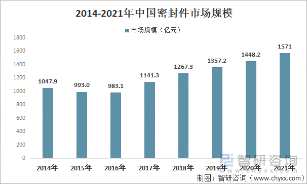 在需求量持续增加及价格走势不断增涨的情况下,中国密封件市场规模保持稳定增长。2021年中国密封件市场规模达1571亿元,同比增长8.5%。
