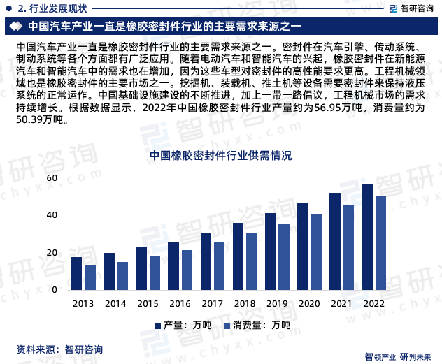 中国汽车产业一直是橡胶密封件行业的主要需求来源之一。密封件在汽车引擎、传动系统、制动系统等各个方面都有广泛应用。随着电动汽车和智能汽车的兴起,橡胶密封件在新能源汽车和智能汽车中的需求也在增加,因为这些车型对密封件的高性能要求更高。工程机械领域也是橡胶密封件的主要市场之一。挖掘机、装载机、推土机等设备需要密封件来保持液压系统的正常运作。中国基础设施建设的不断推进,加上一带一路倡议,工程机械市场的需求持续增长。根据数据显示,2022年中国橡胶密封件行业产量约为56.95万吨,消费量约为50.39万吨。