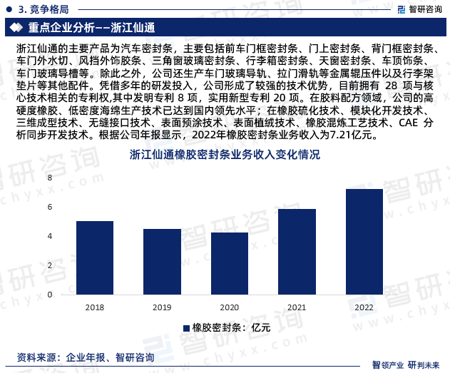 浙江仙通的主要产品为汽车密封条,主要包括前车门框密封条、门上密封条、背门框密封条、车门外水切、风挡外饰胶条、三角窗玻璃密封条、行李箱密封条、天窗密封条、车顶饰条、车门玻璃导槽等。除此之外,公司还生产车门玻璃导轨、拉门滑轨等金属辊压件以及行李架垫片等其他配件。凭借多年的研发投入,公司形成了较强的技术优势,目前拥有 28 项与核心技术相关的专利权,其中发明专利 8 项,实用新型专利 20 项。在胶料配方领域,公司的高硬度橡胶、低密度海绵生产技术已达到国内领先水平;在橡胶硫化技术、模块化开发技术、三维成型技术、无缝接口技术、表面预涂技术、表面植绒技术、橡胶混炼工艺技术、CAE 分析同步开发技术。根据公司年报显示,2022年橡胶密封条业务收入为7.21亿元。