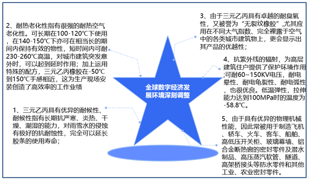 三元乙丙橡胶展现出卓越的抗紫外线特性,并兼备耐低温、耐化学介质、耐臭氧、耐候、耐热老化、耐水等多元物理机械性能,这些优点使得它在许多方面都无法被PVC等其他材料所替代。