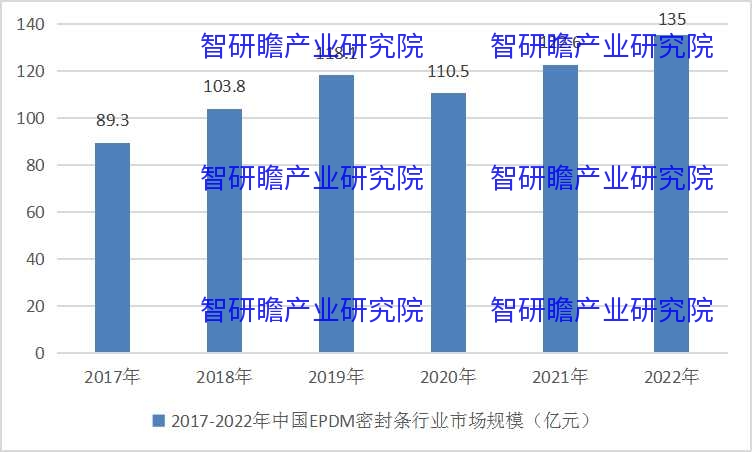 统计数据显示,2017年中国EPDM密封条行业市场规模89.3亿元,2022年中国EPDM密封条行业市场规模135亿元。2017-2022年中国EPDM密封条行业市场规模如下: